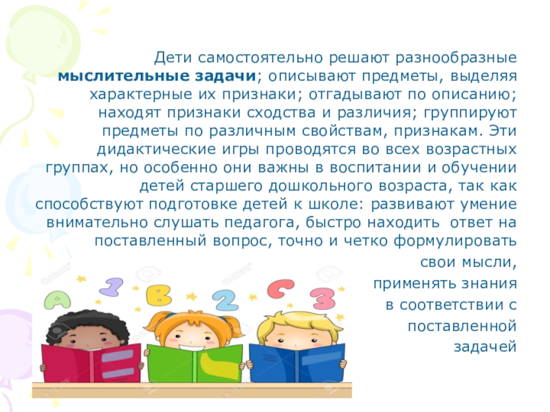 Слайд 12 Дети самостоятельно решают разнообразные мыслительные задачи; описывают предметы, выделяя характерные