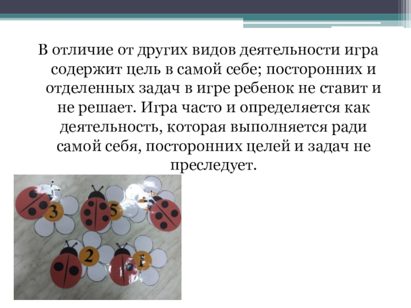Слайд 6В отличие от других видов деятельности игра содержит цель в самой