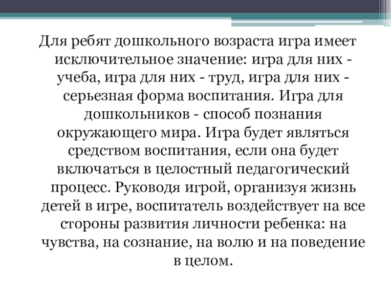 - учеба, игра для них - труд, игра для них - серьезная форма воспитания. Игра для дошкольников - способ познания окружающего мира. Игра будет являться средством воспитания, если она будет включаться в целостный педагогический процесс. Руководя игрой, организуя жизнь детей в игре, воспитатель воздействует на все стороны развития личности ребенка: на чувства, на сознание, на волю и на поведение в целом.