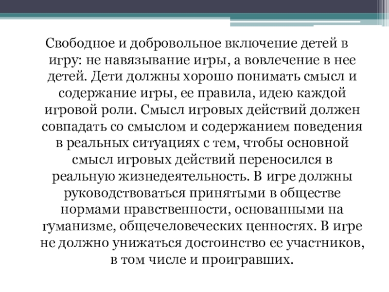 вовлечение в нее детей. Дети должны хорошо понимать смысл и содержание игры, ее правила, идею каждой игровой роли. Смысл игровых действий должен совпадать со смыслом и содержанием поведения в реальных ситуациях с тем, чтобы основной смысл игровых действий переносился в реальную жизнедеятельность. В игре должны руководствоваться принятыми в обществе нормами нравственности, основанными на гуманизме, общечеловеческих ценностях. В игре не должно унижаться достоинство ее участников, в том числе и проигравших.