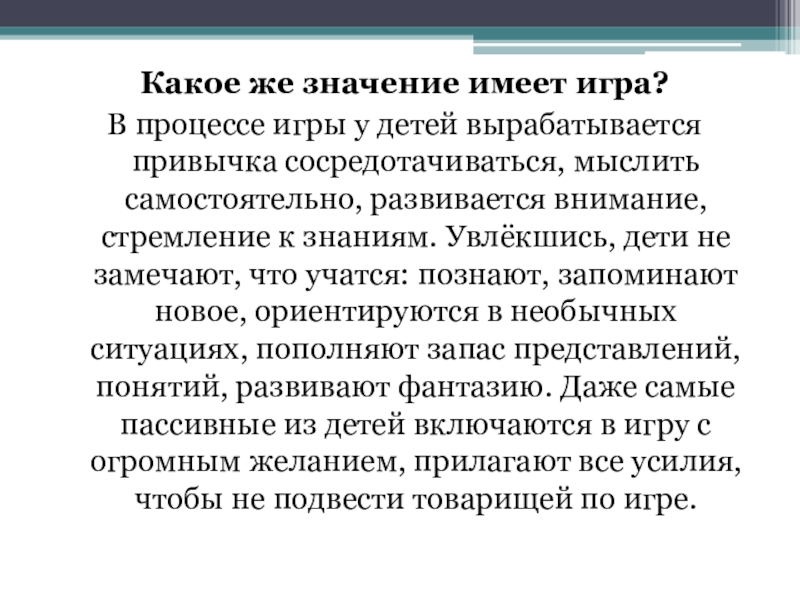 привычка сосредотачиваться, мыслить самостоятельно, развивается внимание, стремление к знаниям. Увлёкшись, дети не замечают, что учатся: познают, запоминают новое, ориентируются в необычных ситуациях, пополняют запас представлений, понятий, развивают фантазию. Даже самые пассивные из детей включаются в игру с огромным желанием, прилагают все усилия, чтобы не подвести товарищей по игре.