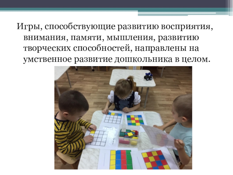 Слайд 5Игры, способствующие развитию восприятия, внимания, памяти, мышления, развитию творческих способностей, направлены
