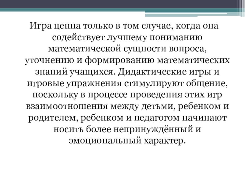математической сущности вопроса, уточнению и формированию математических знаний учащихся. Дидактические игры и игровые упражнения стимулируют общение, поскольку в процессе проведения этих игр взаимоотношения между детьми, ребенком и родителем, ребенком и педагогом начинают носить более непринуждённый и эмоциональный характер.