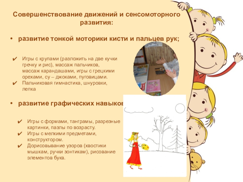 Игры с крупами (разложить на две кучки гречку и рис), массаж пальчиков, массаж карандашами, игры с грецкими орехами, су – джоками, пуговицами.