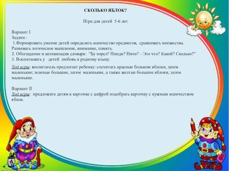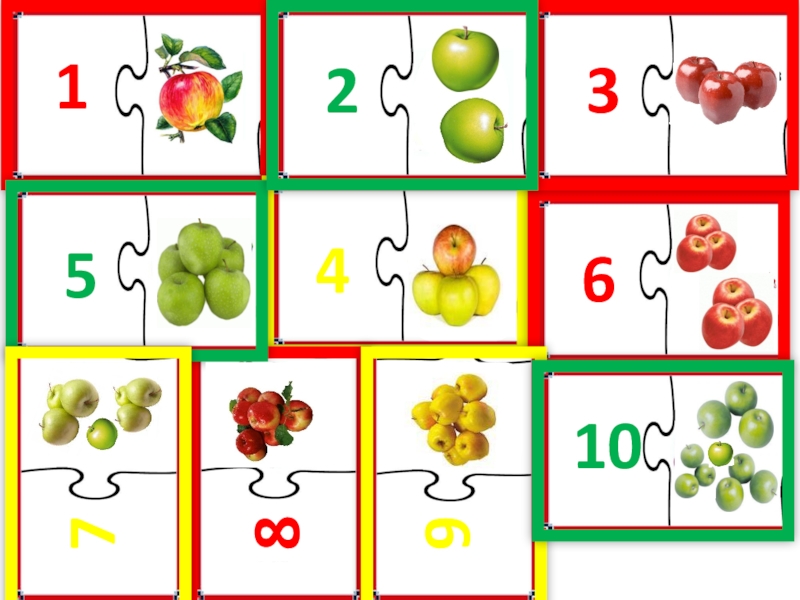 Ход игры: предложите детям к карточке с цифрой подобрать карточку с нужным количеством яблок.