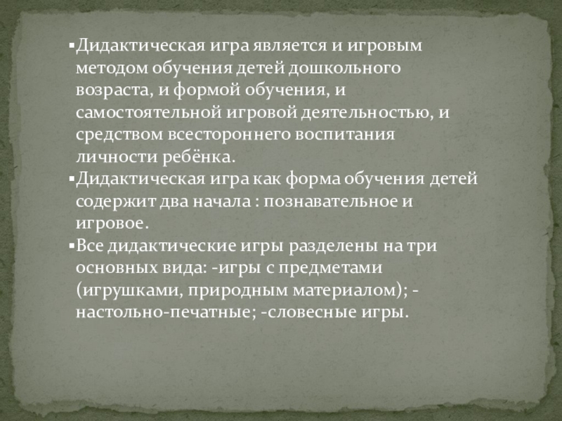 Дидактическая игра является и игровым методом обучения детей дошкольного возраста, и формой обучения, и самостоятельной игровой деятельностью,