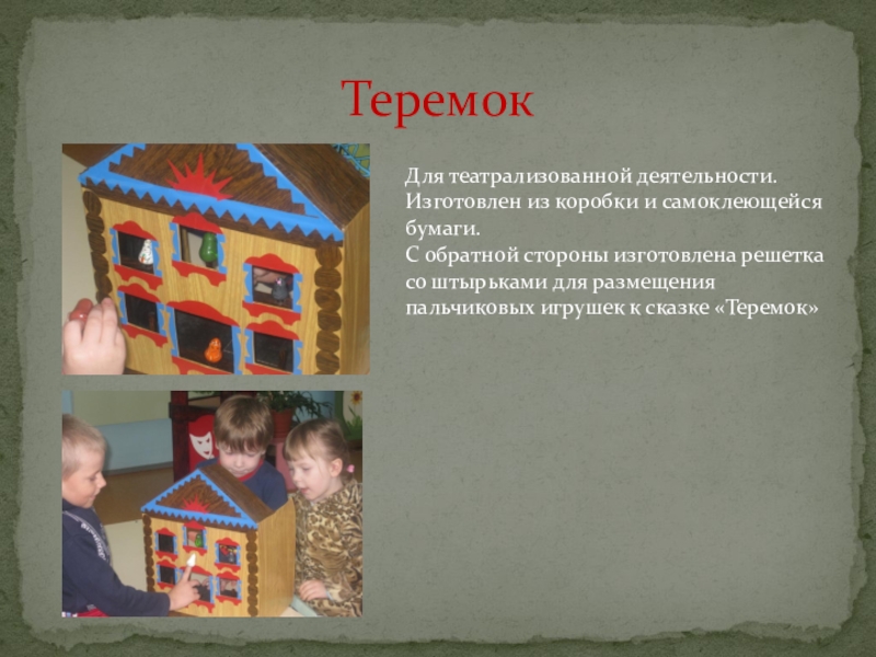 Теремок Для театрализованной деятельности.Изготовлен из коробки и самоклеющейся бумаги. С обратной стороны изготовлена решетка со штырьками для