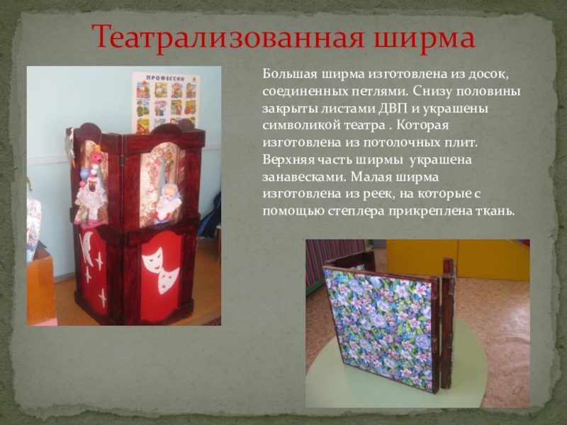 листами ДВП и украшены символикой театра . Которая изготовлена из потолочных плит. Верхняя часть ширмы украшена занавесками. Малая ширма изготовлена из реек, на которые с помощью степлера прикреплена ткань.