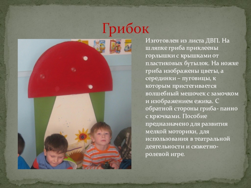крышками от пластиковых бутылок. На ножке гриба изображены цветы, а серединки – пуговицы, к которым пристегивается волшебный мешочек с замочком и изображением ежика. С обратной стороны гриба- панно с крючками. Пособие предназначено для развития мелкой моторики, для использования в театральной деятельности и сюжетно-ролевой игре.