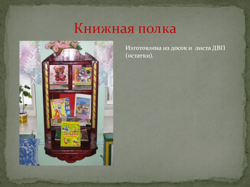 Книжная полкаИзготовлена из досок и листа ДВП (остатки).