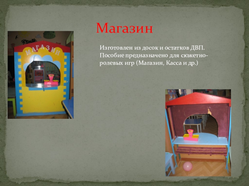 Магазин Изготовлен из досок и остатков ДВП. Пособие предназначено для сюжетно-ролевых игр (Магазин, Касса и др.)