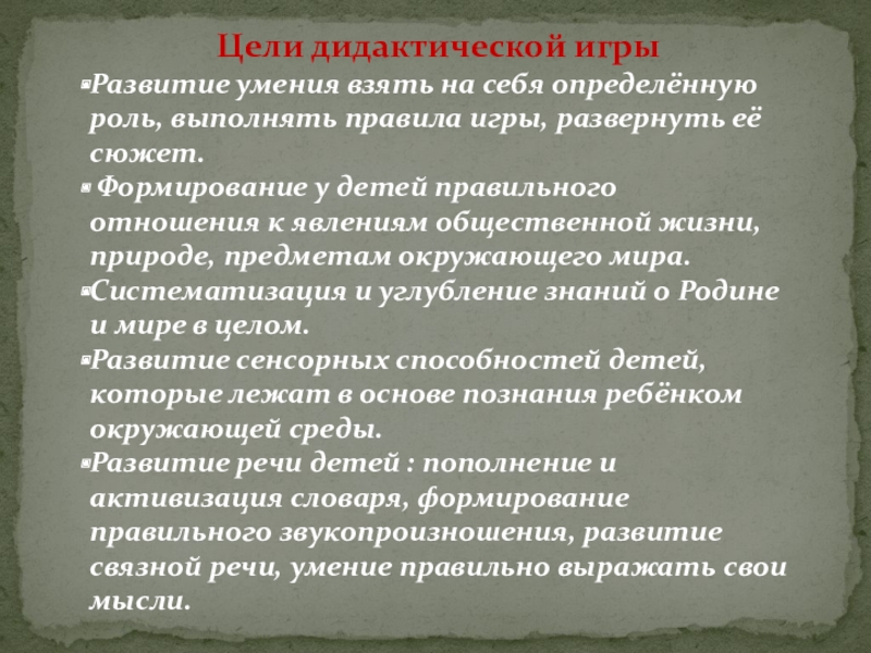 Цели дидактической игры Развитие умения взять на себя определённую роль, выполнять правила игры, развернуть её сюжет. Формирование
