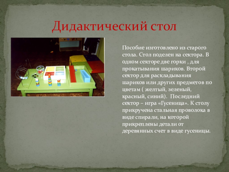 одном секторе две горки , для прокатывания шариков. Второй сектор для раскладывания шариков или других предметов по цветам ( желтый, зеленый, красный, синий). Последний сектор – игра «Гусеница». К столу прикручена стальная проволока в виде спирали, на которой прикреплены детали от деревянных счет в виде гусеницы.