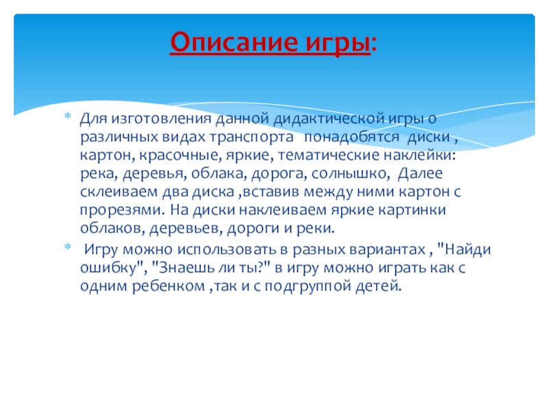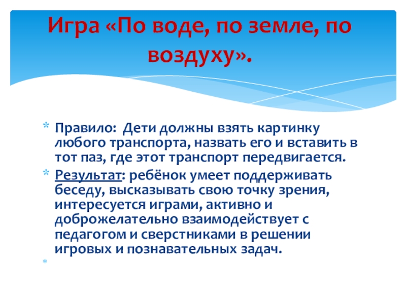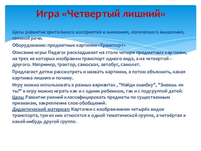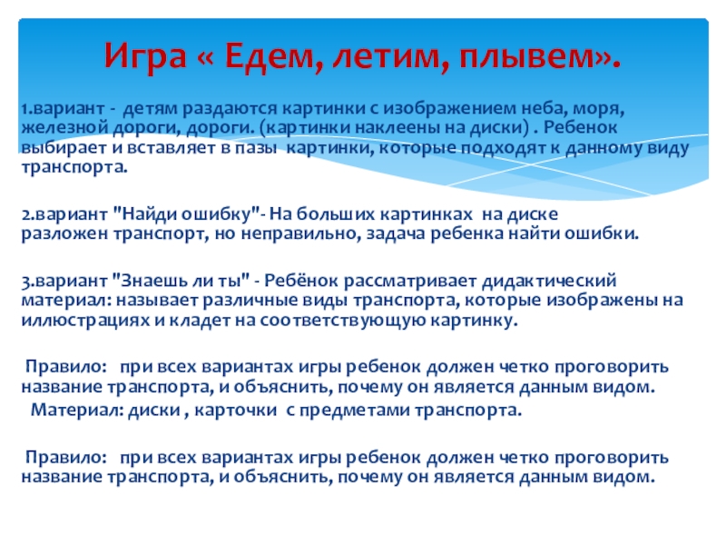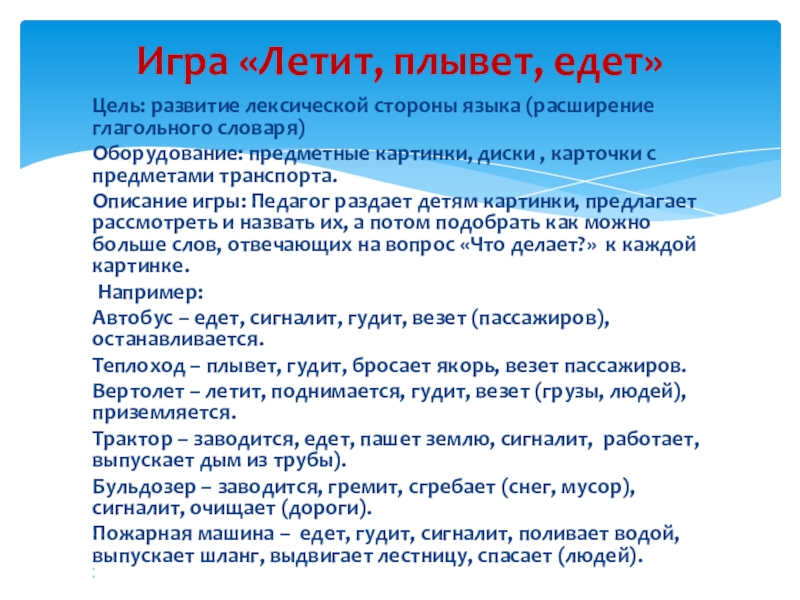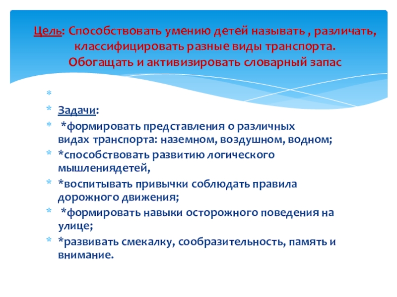 Цель: Способствовать умению детей называть , различать, классифицировать разные виды транспорта.