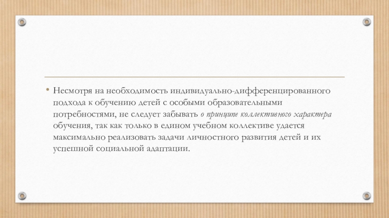 Слайд 13Несмотря на необходимость индивидуально-дифференцированного подхода к обучению детей с особыми образовательными