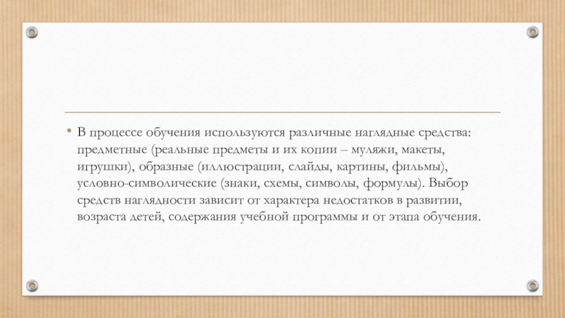 их копии – муляжи, макеты, игрушки), образные (иллюстрации, слайды, картины, фильмы), условно-символические (знаки, схемы, символы, формулы). Выбор средств наглядности зависит от характера недостатков в развитии, возраста детей, содержания учебной программы и от этапа обучения.