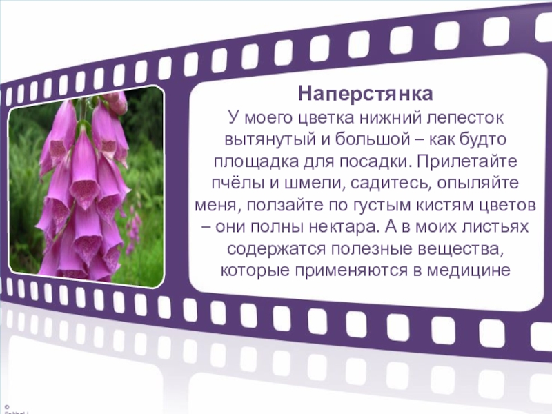 У моего цветка нижний лепесток вытянутый и большой – как будто площадка для посадки. Прилетайте пчёлы и шмели, садитесь, опыляйте меня, ползайте по густым кистям цветов – они полны нектара. А в моих листьях содержатся полезные вещества, которые применяются в медицине