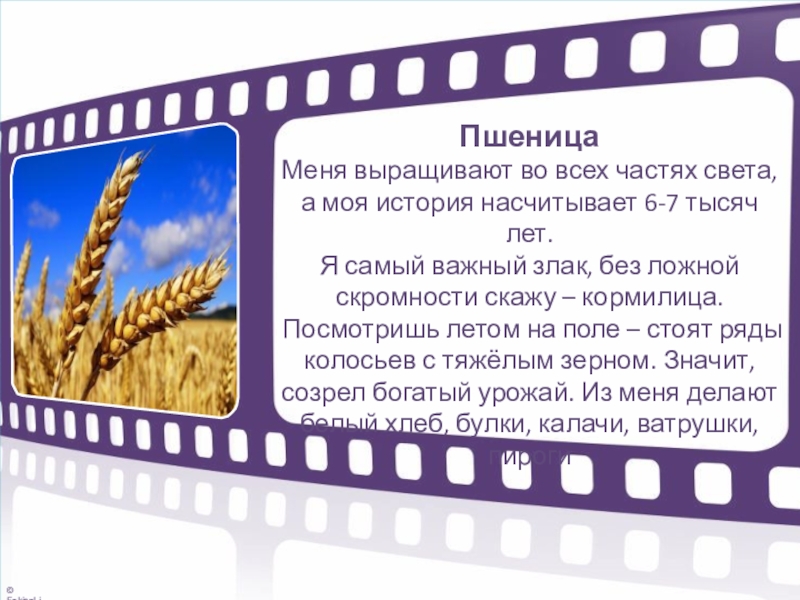 Я самый важный злак, без ложной скромности скажу – кормилица. Посмотришь летом на поле – стоят ряды колосьев с тяжёлым зерном. Значит, созрел богатый урожай. Из меня делают белый хлеб, булки, калачи, ватрушки, пироги