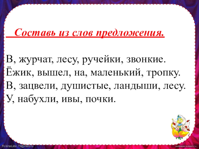 Составь из слов предложения.В, журчат, лесу, ручейки, звонкие.Ёжик, вышел, на, маленький, тропку.В, зацвели, душистые, ландыши,