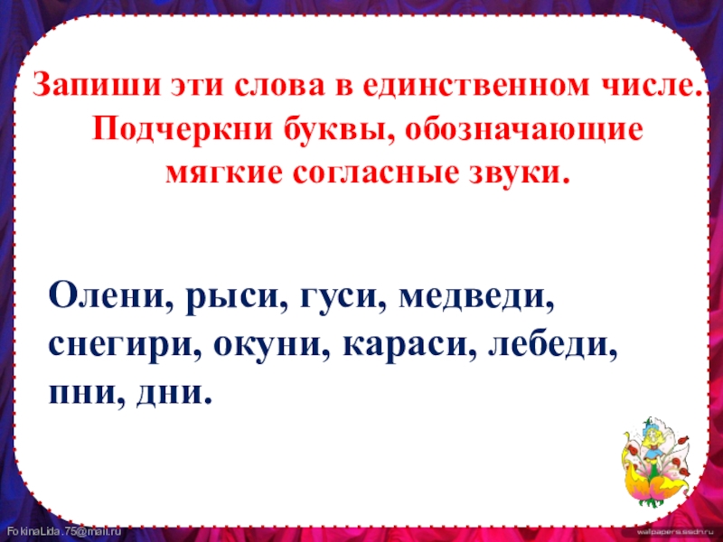 Олени, рыси, гуси, медведи, снегири, окуни, караси, лебеди, пни, дни.Запиши эти слова в единственном числе.Подчеркни буквы, обозначающиемягкие согласные звуки.