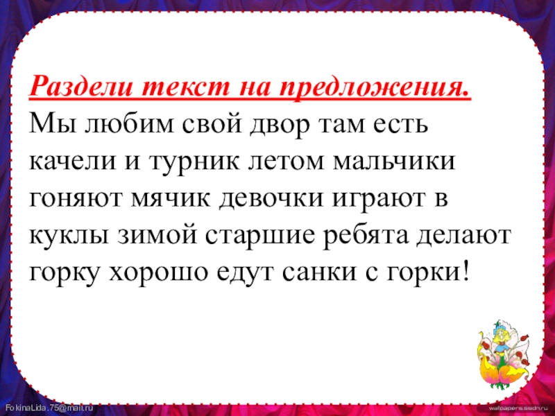 Раздели текст на предложения.Мы любим свой двор там есть качели и турник летом мальчики гоняют мячик девочки