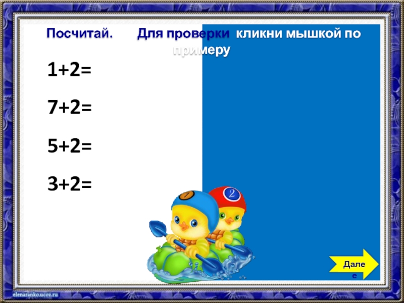 1+2=37+2=95+2=73+2=5 Посчитай.    Для проверки кликни мышкой по примеру