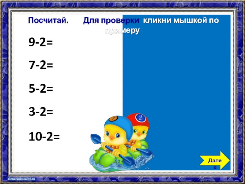 9-2=77-2=55-2=33-2=110-2=8 Посчитай.    Для проверки кликни мышкой по примеру