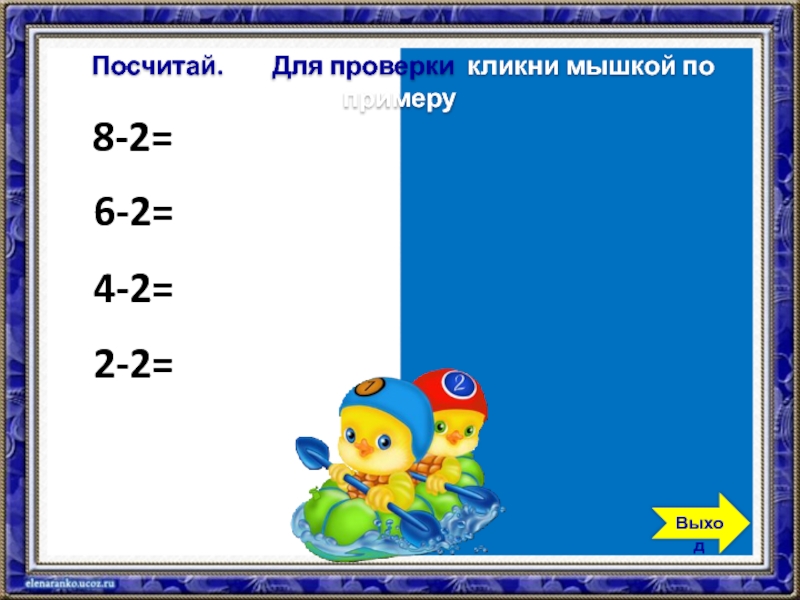 8-2=66-2=44-2=22-2=0 Посчитай.    Для проверки кликни мышкой по примеру