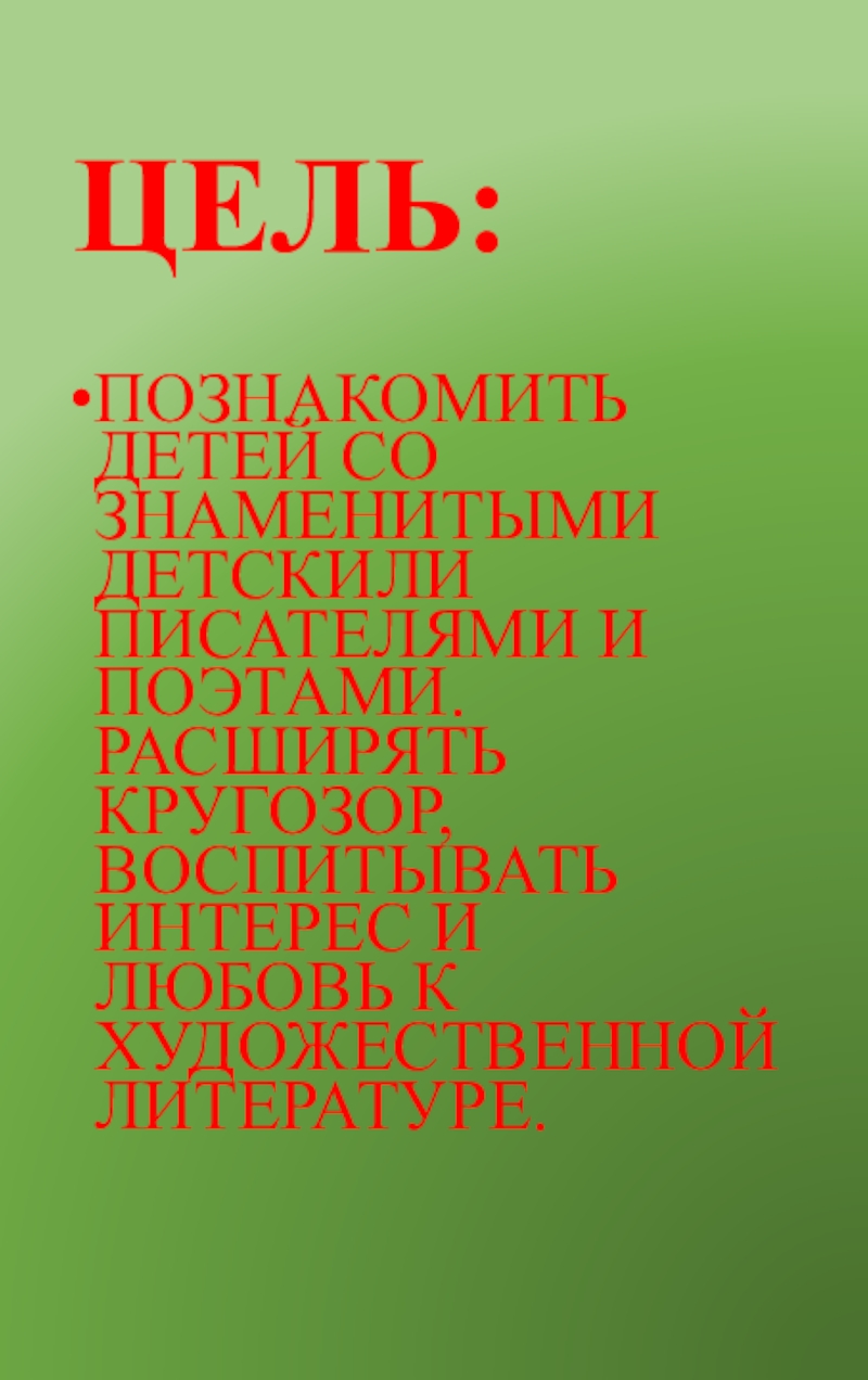 ПОЗНАКОМИТЬ ДЕТЕЙ СО ЗНАМЕНИТЫМИ ДЕТСКИЛИ ПИСАТЕЛЯМИ И ПОЭТАМИ. РАСШИРЯТЬ КРУГОЗОР, ВОСПИТЫВАТЬ