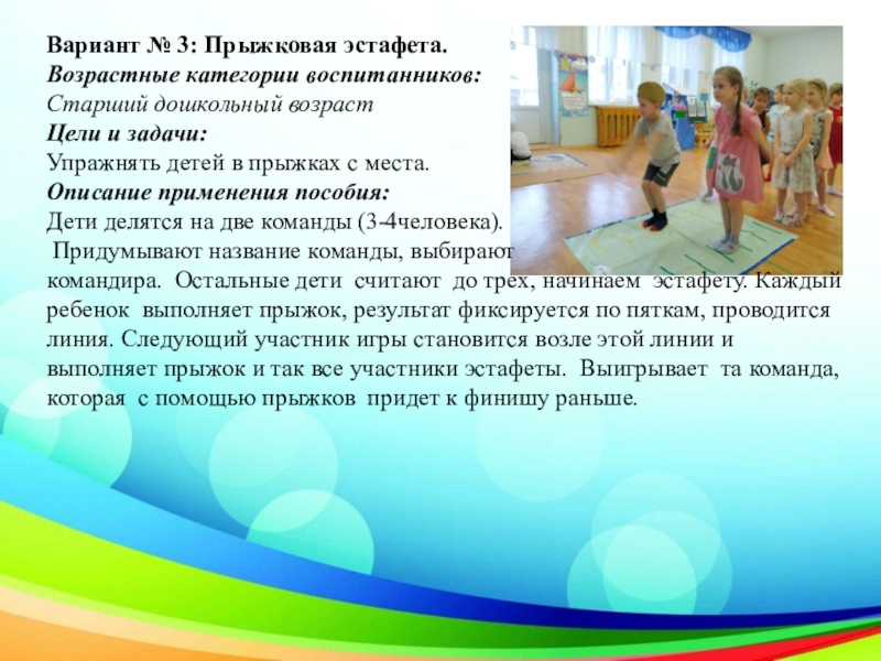 Слайд 13Вариант № 3: Прыжковая эстафета.