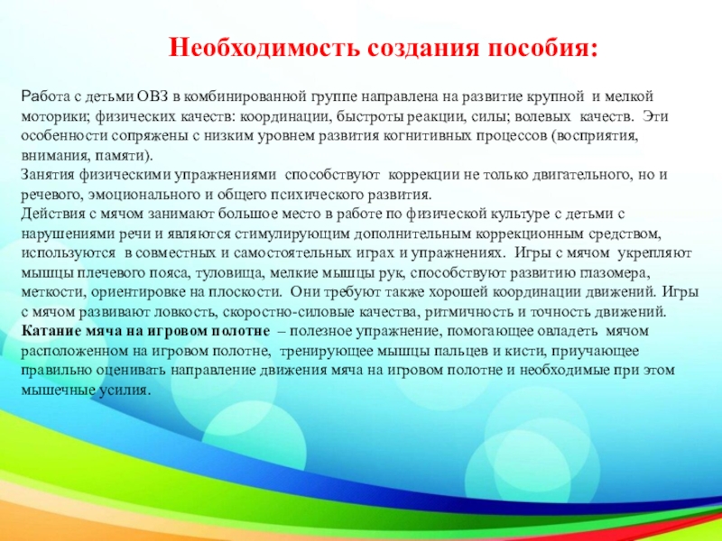 детей с ОВЗ, по развитию общей и мелкой моторики; знакомство с возможностями использования мяча в работе по развитию двигательных навыков.