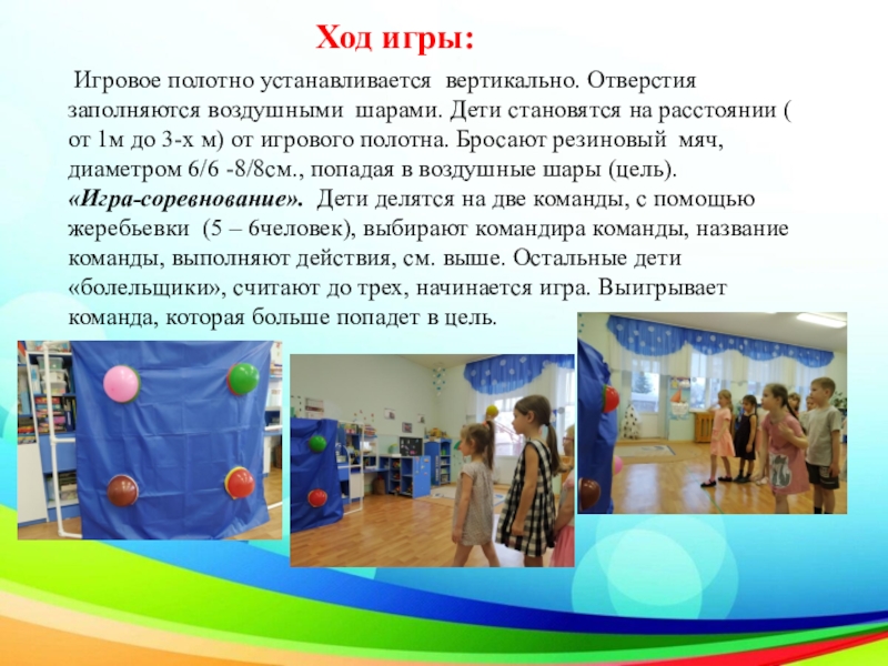 становятся на расстоянии ( от 1м до 3-х м) от игрового полотна. Бросают резиновый мяч, диаметром 6/6 -8/8см., попадая в воздушные шары (цель).