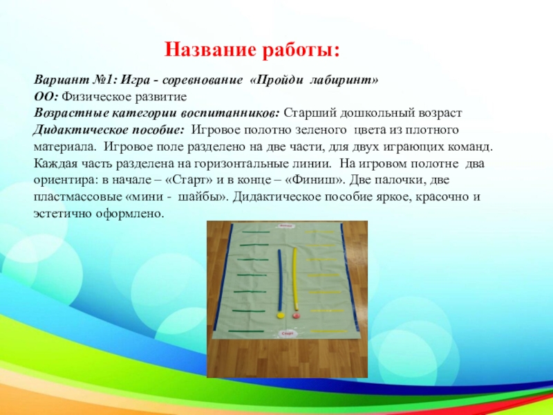 Дидактическое пособие: Игровое полотно зеленого цвета из плотного материала. Игровое поле разделено на две части, для двух играющих команд. Каждая часть разделена на горизонтальные линии. На игровом полотне два ориентира: в начале – «Старт» и в конце – «Финиш». Две палочки, две пластмассовые «мини - шайбы». Дидактическое пособие яркое, красочно и эстетично оформлено.