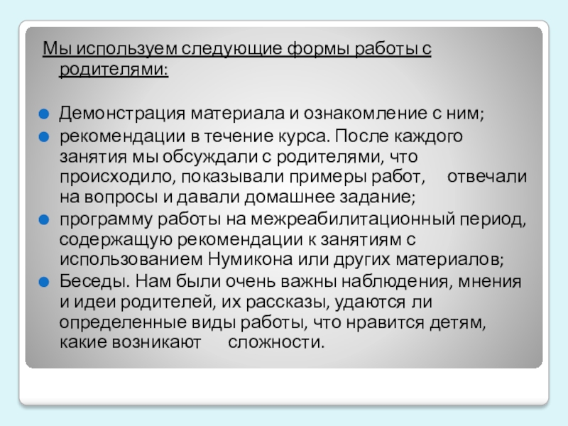 Беседы. Нам были очень важны наблюдения, мнения и идеи родителей, их рассказы, удаются ли определенные виды работы, что нравится детям, какие возникают сложности.