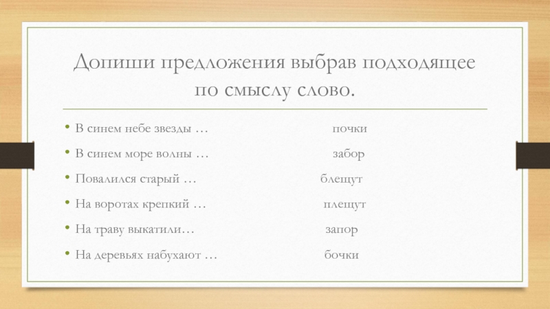 Слайд 3Допиши предложения выбрав подходящее по смыслу слово.