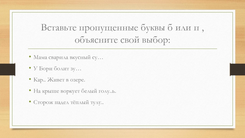 Слайд 5Вставьте пропущенные буквы б или п , объясните свой выбор: