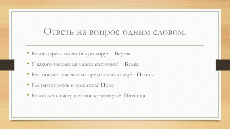 Ответь на вопрос одним словом.Какое дерево имеет белую кору? БерезаУ какого зверька на ушках кисточки? БелкаКто поедает насекомых вредителей в саду? Птицы Где растет рожь и пшеница? ПолеКакой день наступает после четверга? Пятница
