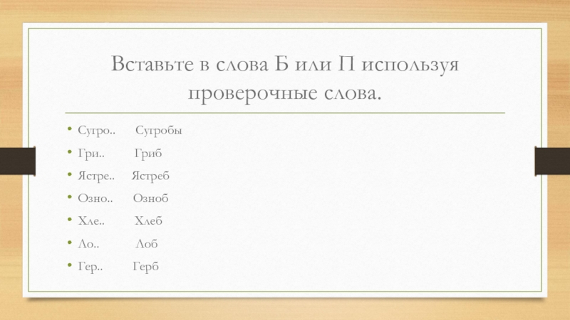 Слайд 4Вставьте в слова Б или П используя проверочные слова.