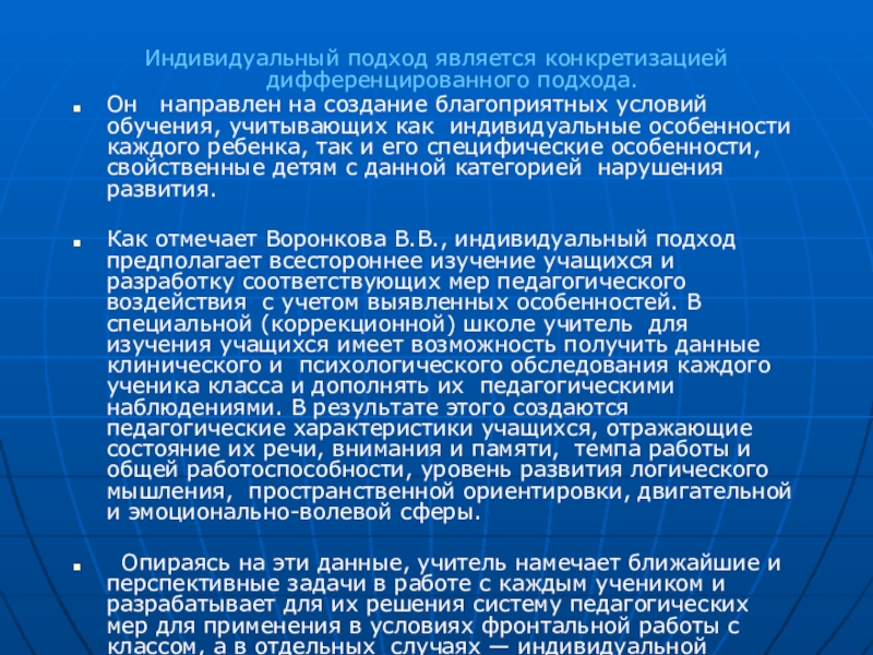 Как отмечает Воронкова В.В., индивидуальный подход предполагает всестороннее изучение учащихся и разработку соответствующих мер педагогического воздействия с учетом выявленных особенностей. В специальной (коррекционной) школе учитель для изучения учащихся имеет возможность получить данные клинического и психологического обследования каждого ученика класса и дополнять их педагогическими наблюдениями. В результате этого создаются педагогические характеристики учащихся, отражающие состояние их речи, внимания и памяти, темпа работы и общей работоспособности, уровень развития логического мышления, пространственной ориентировки, двигательной и эмоционально-волевой сферы.