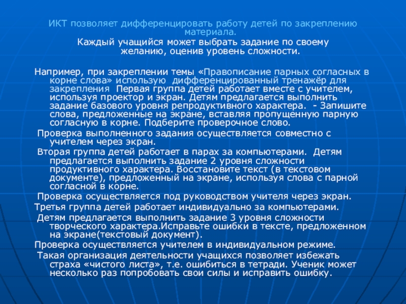 В частности, взаимодействуя с технологией дифференцированного обучения, ИКТ на уроке приобретают адресный характер, подбираются с учетом особенностей конкретного класса.