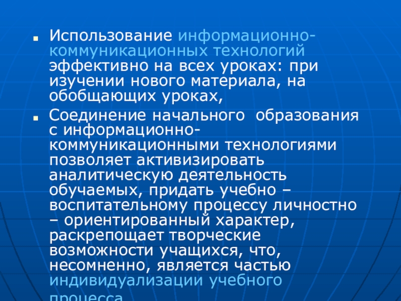 Соединение начального образования с информационно-коммуникационными технологиями позволяет активизировать аналитическую деятельность обучаемых, придать учебно – воспитательному процессу личностно – ориентированный характер, раскрепощает творческие возможности учащихся, что, несомненно, является частью индивидуализации учебного процесса.