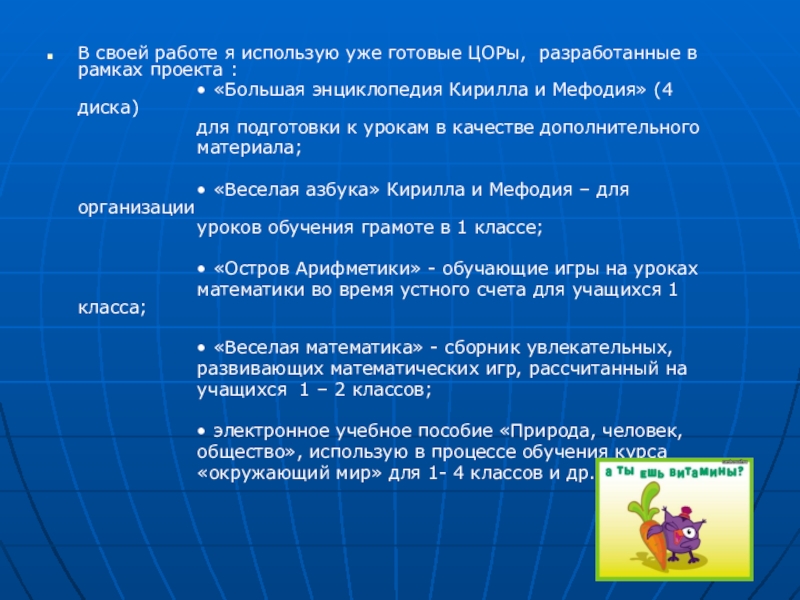 Слайд 22В своей работе я использую уже готовые ЦОРы, разработанные в рамках