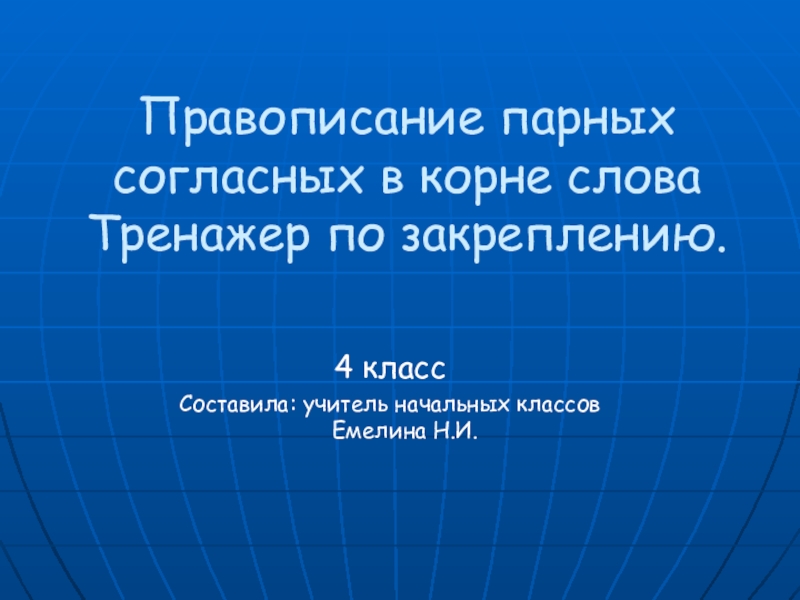 Например, при закреплении темы «Правописание парных согласных в корне слова» использую дифференцированный тренажёр для закрепления Первая группа детей работает вместе с учителем, используя проектор и экран. Детям предлагается выполнить задание базового уровня репродуктивного характера. - Запишите слова, предложенные на экране, вставляя пропущенную парную согласную в корне. Подберите проверочное слово.