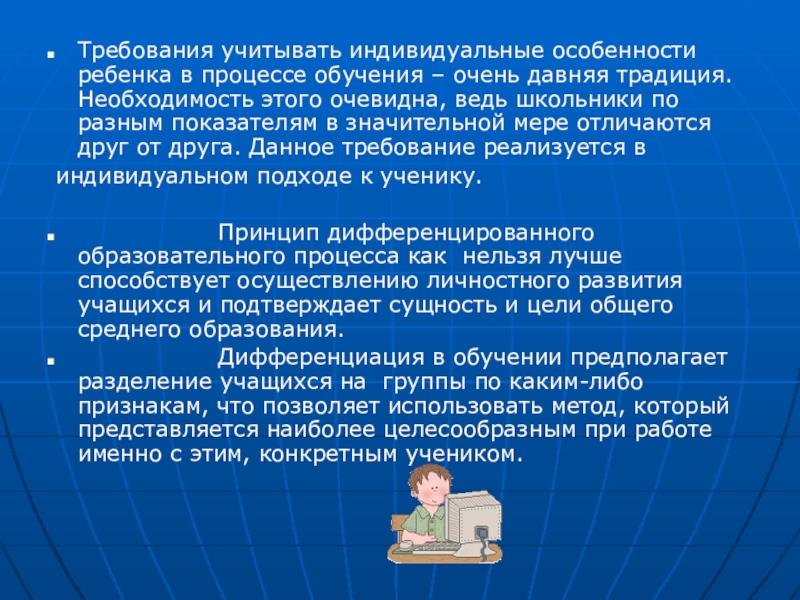 Слайд 10Требования учитывать индивидуальные особенности ребенка в процессе обучения – очень давняя
