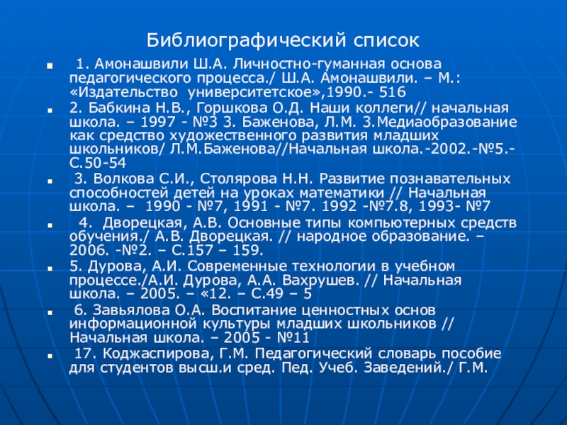 1. Амонашвили Ш.А. Личностно-гуманная основа педагогического процесса./ Ш.А. Амонашвили.