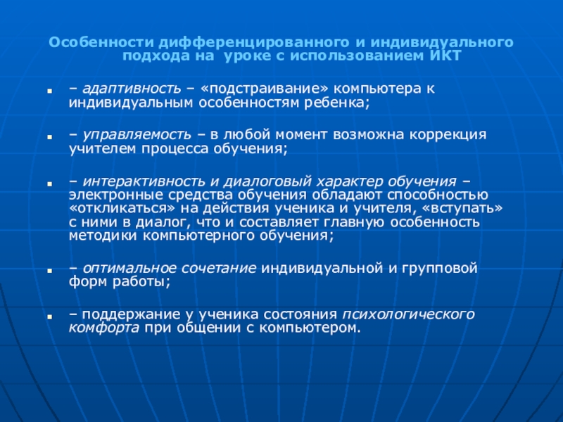 Слайд 18Особенности дифференцированного и индивидуального подхода на уроке с использованием ИКТ