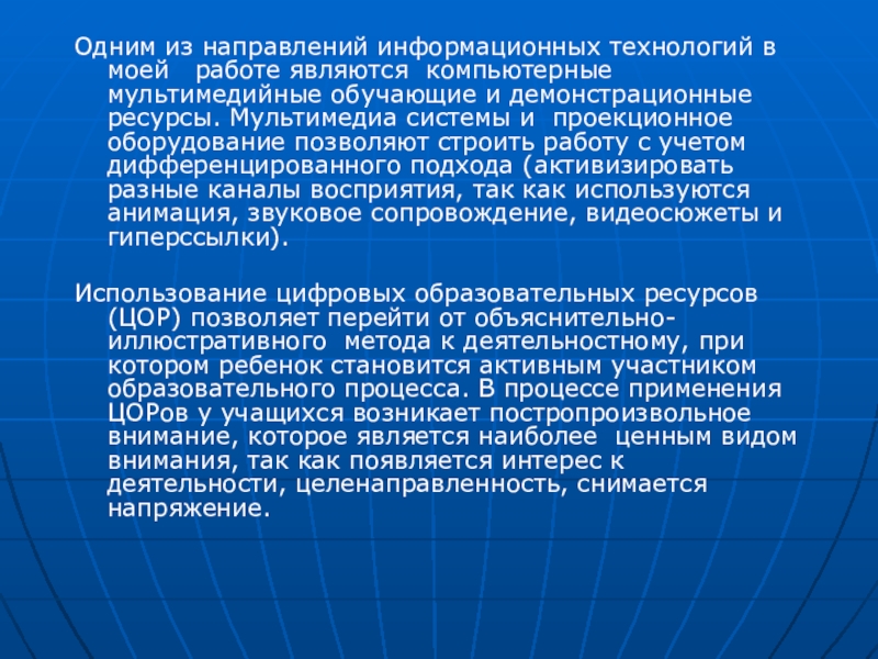 мультимедийные обучающие и демонстрационные ресурсы. Мультимедиа системы и проекционное оборудование позволяют строить работу с учетом дифференцированного подхода (активизировать разные каналы восприятия, так как используются анимация, звуковое сопровождение, видеосюжеты и гиперссылки).