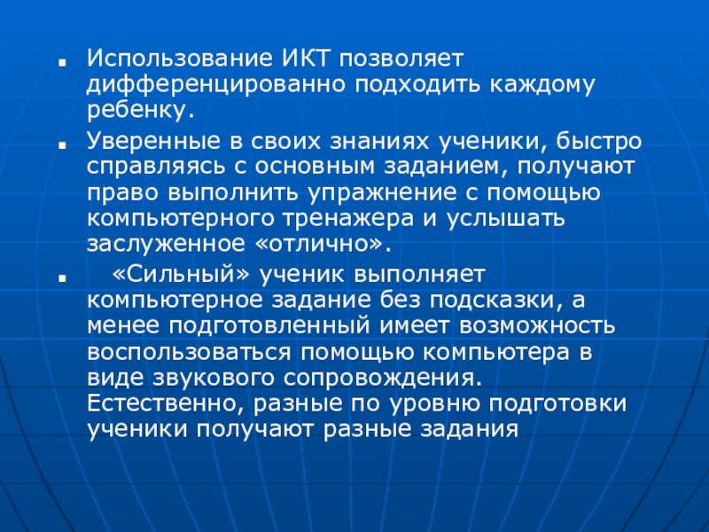 Слайд 7Использование ИКТ позволяет дифференцированно подходить каждому ребенку.