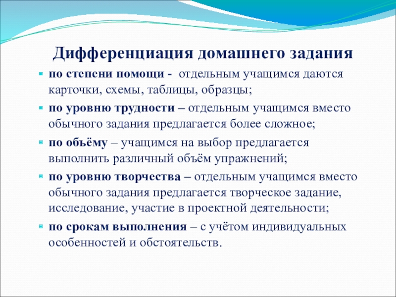 Дифференциация домашнего заданияпо степени помощи - отдельным учащимся даются карточки, схемы, таблицы, образцы;по уровню трудности – отдельным