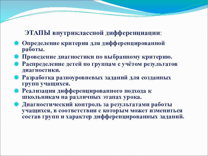 ЭТАПЫ внутриклассной дифференциации:Определение критерия для дифференцированной работы.Проведение диагностики по выбранному